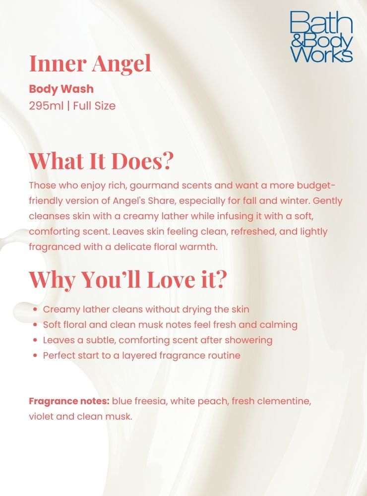 A gentle body wash that cleanses skin with a creamy lather while maintaining moisture. Leaves skin feeling clean, refreshed, and lightly scented with a soft, comforting fragrance.