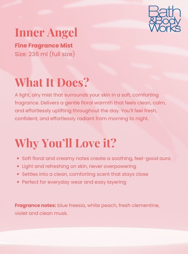A light, airy fine fragrance mist that wraps the skin in a soft, comforting scent. Designed for everyday wear, it refreshes beautifully and leaves a gentle, feel-good fragrance that stays close to the skin.